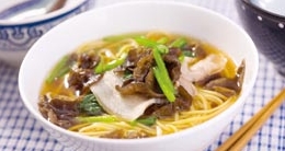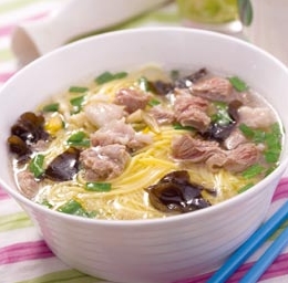 [材料] 中筋面条200克,猪肉丝50克,蛋皮丝50克,水发黑木耳丝50克,葱丝10克,酱油2小匙,精盐1小匙,味精2克,植物油30克,香油1/2小匙,姜末1小匙。