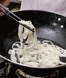 ③ 用猪肉、菠菜、油菜、香菇、冬笋、豆芽炒成卤汁,坐锅待水开后,拿出面剂,手拿两端,扯成薄而未断的面片,入沸水锅中煮熟捞出。