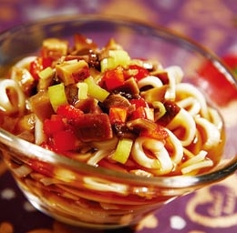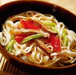 [材料] 挂面150克,猪瘦肉、香菇、黄瓜各100克。鲜汤720克,青椒、红椒各20克,酱油、料酒各1大匙,醋、辣椒油各2/3大匙,精盐、味精、胡椒粉各1/2小匙,香油1小匙,葱末、姜末各1/2小匙,植物油2大匙。
