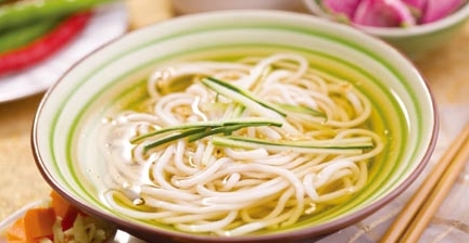 ④ 另起锅,下入鲜汤,待烧沸后,再下入青椒圈、红椒圈、调味料,调好口味,浇入面碗中即可。