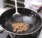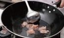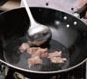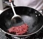 ② 锅内加油烧热,放入干辣椒丝炸香,下入牛肉末炒至变色。