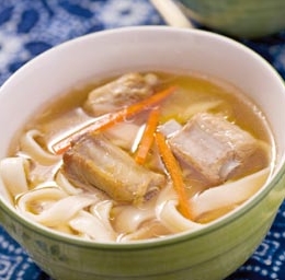 ⑦ 每碗面条上放5块排骨,浇入烧开的鸡汤,撒一点香菜段即成。