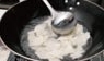 ② 锅置于火上,加2/3容积清水,旺火烧沸后,用漏勺的圆眼将面糊过滤,漏在沸水中,煮5分钟至熟,捞出面疙瘩沥净水后装入碗中。