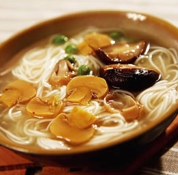 [材料] 龙须面200克,香菇、罐装口蘑、玉米笋、草菇、猴头蘑、豌豆各25克。菌菇汤700克,葱末、姜末各1/2小匙,植物油15克,精盐、味精各2/5小匙,料酒1大匙。