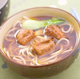 [材料] 拉面150克,酱排骨100克,油菜30克。葱丝、姜丝各1小匙,酱油1大匙,精盐、味精、胡椒粉各1/3小匙,鲜汤500克,植物油15克。