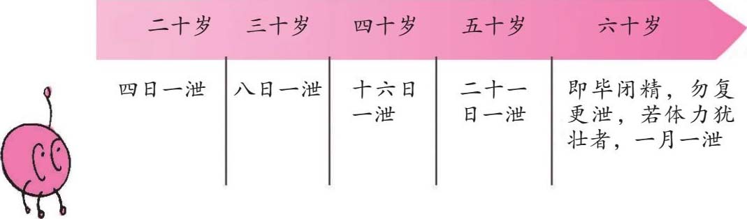 在婚姻生活中,维系夫妻双方情感纽带,自然是爱与性。但在我国古代的房室养生中,提出禁欲对健康的危害,恣情纵欲有损天年。《素女经》中说:“人有强弱,年有老壮,各随其气力。”并且具体指出:人年二十者,四日一泄;年三十者,八日一泄;年四十者,十六日一泄;年五十者,二十一日一泄;年六十者,即毕闭精,勿复更泄也,若体力犹壮者,一月一泄。