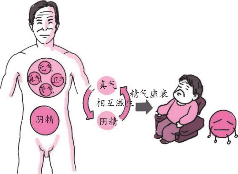 2.精气虚衰:这里的气,指真气,包括元气、营气、卫气、脏腑之气等,是生命活动的根本和动力,为生化之根;精,即阴精,包括肾脏所藏先天之精在内,是构成人体和促进生长发育的基本物质基础。精与气相互资生,是维系生命的关键。精充、气足,才能延缓衰老,健康长寿;而精亏、气惫,是早衰、变老的原因。