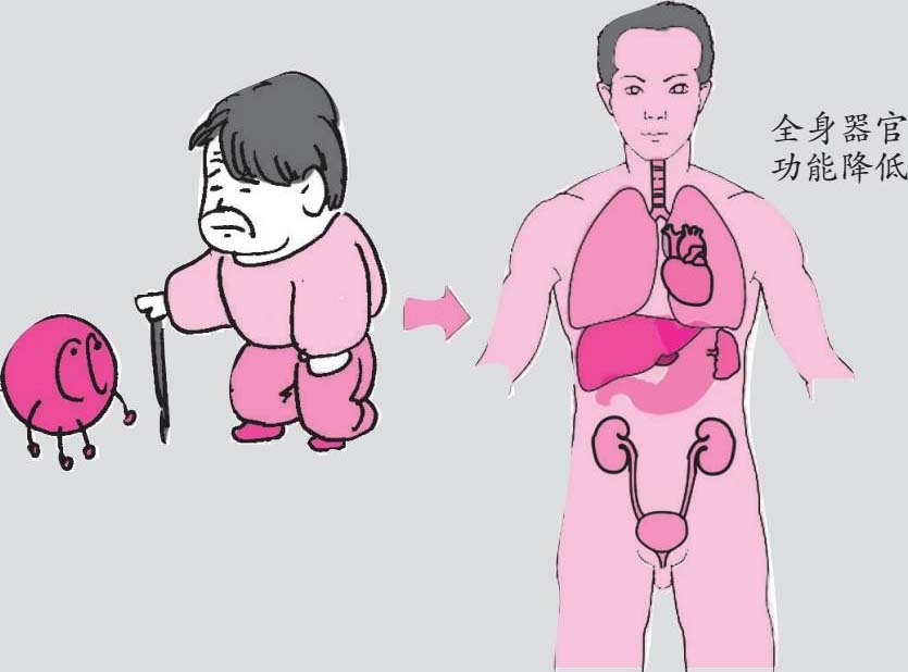可见,衰老不是一两个器官,而是包括全身几乎所有的器官,这也是和患病后器官功能降低所不同的情况。例如有人患肝炎时,他的肝功能会降低,但其他器官功能的损害并不明显。而人在衰老时,器官功能的降低却几乎涉及全身所有的器官。由于功能性细胞数量的减少,引起生理活动的改变,如器官的耗氧量降低和功能储备量减少;血液循环量减少;有些器官的功能可因老化而完全丧失,如女性绝经后,卵巢停止排卵等;解剖结构完好,但可出现功能减退,如神经传导速度变慢等;少数器官的功能可出现反常的提高。归纳起来,人体的老化过程,不管发生的机理如何,总存在着细胞的逐渐丧失,表现为器官的大小、重量和细胞数量的改变。