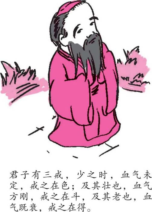 儒家学派的鼻祖孔子,就是我国古代养生大师,且为养生学说奠定了理论基础。如孔子的“君子有三戒,少之时,血气未定,戒之在色;及其壮也,血气方刚,戒之在斗;及其老也,血气既衰,戒之在得。”这里的“三戒”,即是根据人的年龄不同,生理特点不一样,而提出的具体养生方法。除三戒外,孔子还提出了“仁者寿”的养生理论,如他在《中庸》中提出“修身以道,修道以仁”,“大德必得其寿”,意思是只有具备高尚道德修养的人,才可获得高寿。