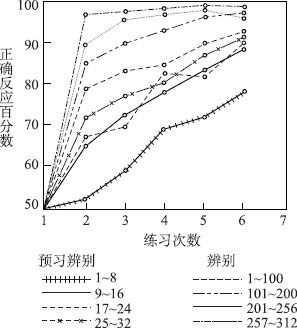 图3—18是300多个辨别学习的曲线。最下面的曲线是最初的8个辨别学习的曲线,猴子要经过6次练习才达到70%以上的准确率。随着学习经验的积累,辨别速度越来越快,到了最后一组辨别学习(即最上面的曲线所示),第二次练习的正确率达97%。这时猴子已经学会了如何学习,在对两个刺激的辨别有了认知之后,它们不必经过多次的尝试错误,就能正确辨别。换句话说,猴子已经取得了学习心向。