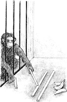 1920年柯勒(Wolfgnag Kohler)用猩猩做了一项最早的顿悟学习研究。柯勒让关在笼子里的猩猩,无法用手直接取得笼子外的香蕉(见图3—19)。猩猩蹲踞栅栏后,使靠近香蕉的木棒最长,靠近猩猩的最短。起初猩猩用较短的木棒钩取香蕉不成功;利用笼子的铁丝也行不通。猩猩停了下来,审视四周环境后,才恍然大悟,它用短棒拉近长棒,拿起长棒取得香蕉。猩猩解决问题的方式是一种豁然开朗的顿悟,这与猫经过尝试错误之后,逐渐学会打开门闩的历程不同。