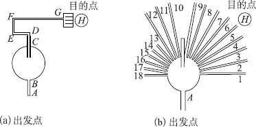 MacFarlane在20世纪30年代的一项实验中训练老鼠学得跑迷津后,又在迷津中注水。结果发现老鼠以游泳的方式完成迷津,并没有多大困难。行走和游泳显然是两组不同的动作,但老鼠学会的不是肌肉动作,而是达致目标的方位。托尔曼等训练老鼠学习图3—20(a)所示的迷津,路线从A穿越圆桌,直往前方的通道,然后向左,最后到达目标。在老鼠学会了从A到达食物所在的目标后,堵住由A到前方的通道,但另有18条通道可供选择(见图3—20(b))。