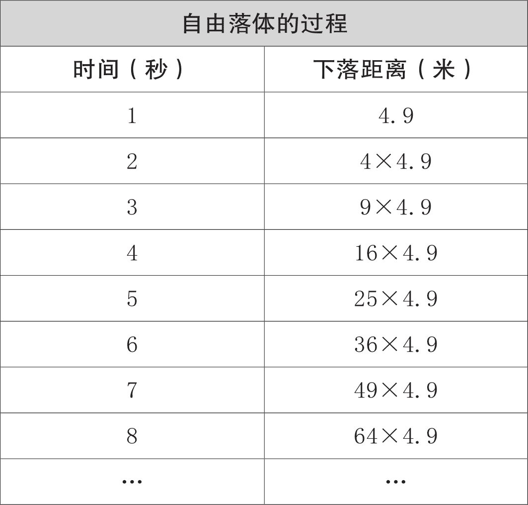 注意到了吗?4=2×2,9=3×3,16=4×4,25=5×5。也就是,如果要计算物体在某一时间内掉落的距离,那么就要把这个时间乘以它运动的时间,然后再乘以4.9。