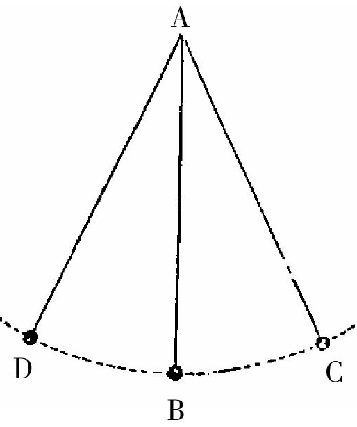 我们在一根细绳的一端,系上一个铅球。将绳子的另一端固定在一个地方,比如说A处,如图22所示。那么小球在摆动了几下之后就会处于静止状态。你们也会知道,绳子在最后会处于垂直的方向,即AB的方向。现在我们将小球拉至C处,然后放手。如果绳子没有系着小球的话,那么小球就会沿着直线方向下落;但是由于小球是被系在绳子上的,因此它就没有这样向地下落。小球受到地球引力的牵引,以悬挂它的点A为圆心,沿着圆上的弧CD滑落。当它到达点B的时候,它还要顺着这条弧继续向前到达点D。到了点D之后,它会重新折返,沿着弧CD滑落到点C的位置。而最后它又回到点D的位置。如此这般,经过一段很长的时间,直到空气阻力让它停止运动。假如细绳在点A处悬挂得很好的话,那么小球会来回运动至很长一段时间才静止不动。小球每次来回的这种运动,即从C到D、又从D到C的一次来回的周期运动,我们称之为摆动。同样,细绳以及拴在细绳上的小球,我们称之为摆。摆的摆动是由使物体下落的地球引力而产生的。小球的摆动区间是由悬挂的细绳所决定的。在小球的来回运动中,它沿着想象的圆弧CD而滑动,要么从左到右,要么从右到左,路线从来不会改变。在摆动过程中,小球的速度可能会慢下来,可能只经过圆弧CD的一部分,但它的路径从来不会改变。如果没有外在的力量来改变小球,那么小球就会沿着同一条圆弧来回摆动,并且这种摆动会一直长年累月地继续下去,而不会作任何改变。总而言之,摆动的圆弧这条路线会一直保持不变。因为在这样的一个装置中,没有任何力量能够使小球偏离原来的路线,它不会往这边偏一点点,也不会往那边偏一点点。