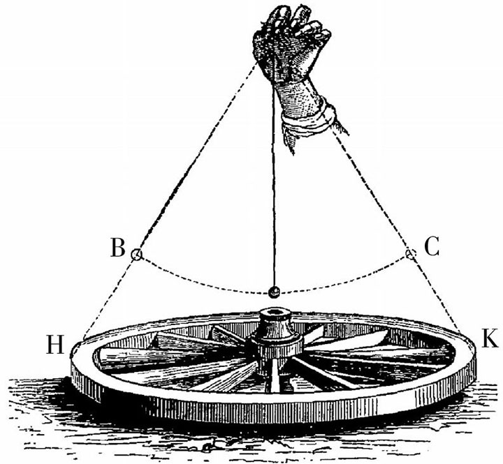 ↓6. 如图23所示,我们在地面上放了一个车轮。在它的上方正对着轴的地方放了一个摆动着的摆。我们观察到,摆经过的弧线BC与轮上的点H与K相对应。如果车轮是静止不动的,而摆经过的弧线BC其路径不会改变。那么,摆在它的两个端点B与C,总是跟车轮上的点H与K相对应。这一点是显而易见的。但如果车轮是转动着的,那么点H与K的位置就会移动,车轮上跟B与C相对应的点也就会不断变动。如果车轮的运动通过某种方式被掩盖了,甚至我们都没察觉到这种运动,那么会发生什么呢?这种情形就仿佛我们坐在一辆向前行驶的车上,看到田野中的树都向着相反方向移动一样,我们也会产生类似的幻觉。由于摆的摆动经过的弧线是不动的,它一直不停地与车轮上的点相对应;而我们以为车轮是静止不动的,但实际上它是不停地在运动着的。这样一来,摆动所经过的弧线就会不停地对应着车轮上的不同点,由于我们以为车轮是静止不动的,因此我们就会认为是摆动弧线在转动了。如果车轮是从右向左转动的,那么在我们看来,摆的弧线就仿佛是从左向右转动了。