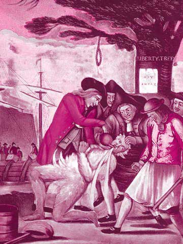 1765年3月22日,英国议会又通过了《印花税法》。一些思想比较激进的人士为阻止《印花税法》生效,举行游行示威,高呼“要自由,不要印花税”,捣毁税局,放火焚毁成堆的税票,迫使税吏辞职,有些地方甚至发生了暴乱。在波士顿,一群反《印花税法》的人冲进当地一位名叫安德鲁·奥利弗的印花税票代销人家里,威胁着要杀了他。次日,这位代销人别无选择地被迫辞职了,其他印花税票代销人也都纷纷挂职而去。在纽约,副总督科尔登在一群反《印花税法》人的冲击下逃到英国军舰上寻求保护,这群人随即袭击了伯特利要塞,冲击了总督的马车房,焚毁了印花税票,随后来到一位曾威胁要把《印花税法》从人们的喉咙里塞下去的守备军官家里,砸烂了他的家具与摆设,铲平了他的花园。