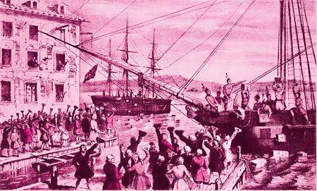 由于约翰·汉考克领导抵制英国政府所经营的英属东印度公司,致使其茶叶销量一落千丈,1773年英国国会颁布茶税法,以帮助本国商人向北美倾销,并由英属东印度公司垄断茶叶贸易。1773年12月16日,一批茶叶被运到波士顿港口,自由之子——由60个当地人组织而成——打扮成印地安人偷偷摸到三艘船上,将船上货物捣毁,并将342箱茶叶倒入港口内,整个过程相当平和安静。不过此举被认为是对殖民政府的挑衅,英国政府派兵镇压,终于导致1775年4月美国独立战争的第一声枪响。