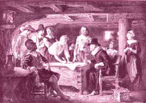 1620年9月16日,有102人一起登上名叫“五月花号”的轮船,离开了英国的普利茅斯港。这102人里有一半是清教徒,其他则是破产的农民、工匠与渔民。“五月花号”原本是一艘往返于英国与法国之间运酒的商船,经过改装后全长27米,负载180吨。经过60多天的颠沛流离,11月19日,移民们终于看到了北美洲东海岸的科德角(Cape Cod),他们准备继续航行到哈德逊河(当时那里是弗吉尼亚公司的管辖范围),但由于遭遇海上风浪,风向改变,再加上携带的食物与淡水即将用尽,他们只得折返科德角。11月21日,他们在普利茅斯湾登上了美洲新大陆的土地。