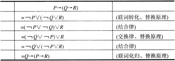 表1-9所示示例是一个等值推演。在上述命题演算下,并未使用真值表,也证明了公式P→(Q→R)与Q→(P→R)逻辑等值。