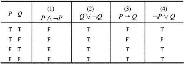 表1-8是命题公式(1)P∧﹁P;(2)Q∨﹁Q;(3)P→Q;(4)﹁P∨Q的真值表。