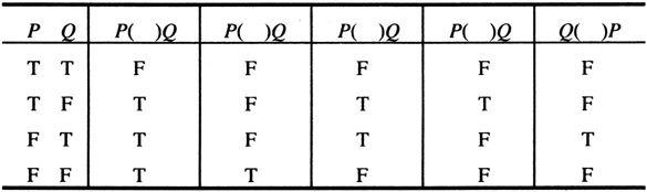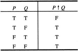 命题P与Q的与非是命题P↑Q,读作P与非Q。P↑Q取值假,当且仅当P与Q同取真值真。从真值表(见表1-12)易见:P↑Q=﹁(P∧Q)。