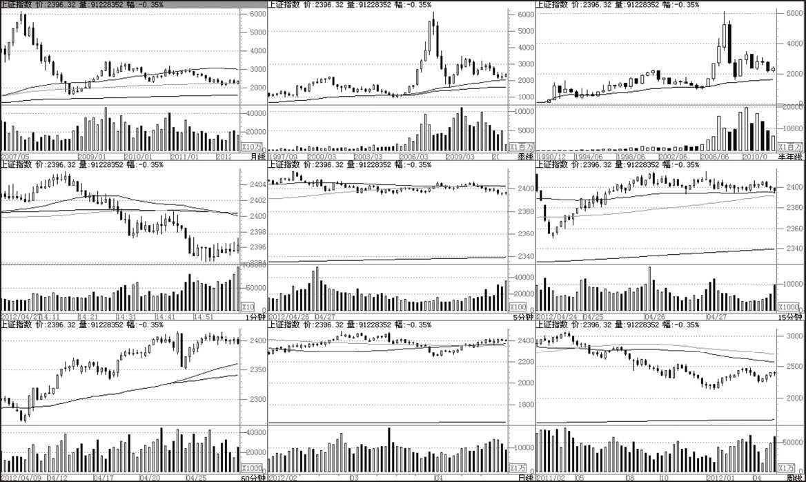 不同周期的K线所反映的信息的作用是不一样的。越是长期的K线越能说明后期的长期股价趋势,越不容易被庄家或主力所利用而形成骗线。周K线、月K线常用于研判中期行情,年K线常用于研判长期行情。对于短线操作者来说,1分钟K线、5分钟K线、15分钟K线、30分钟K线和60分钟K线同样具有重要的参考价值。本书中主要以日K线为研究对象。