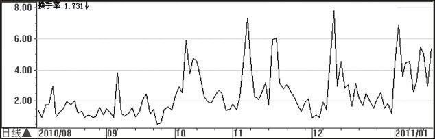大智慧股票分析软件中提供的换手率指标如图1-12所示。换手率指标由横坐标和纵坐标组成,横坐标代表单位时间,纵坐标代表的是对应单位时间的换手率数值。换手率指标将单位时间内的换手率用曲线的形式直观地表现出来。