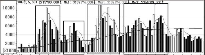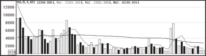 成交股数非常适合于对成交量做纵向的对比,即观察历史上成交量变化的情况。但它的缺点在于忽略了个股流通量大小的差别,难以精确表示成交活跃的程度,不便于对不同的个股做横向的比较,也不利于掌握主力的进出情况。虽然如此,该指标还是目前最常用的研判成交量的工具。本书中所提到的成交量指的都是成交股数。