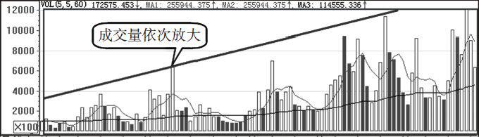 堆量是指当主力在低位想拉升股价时,经过几天或几周的成交量缓慢放大,股价被慢慢推高,成交量在近期的K线图上形成了一个像土堆一样的形态,土堆的样子越漂亮,就越可能产生大的拉升行情,如图1-15所示。相反,如果在高位形成堆量的成交量,很有可能表明主力已经在大举出货了。