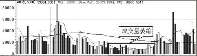 缩量是指市场成交极为清淡,造成的交易量能的大幅萎缩,如图1-13所示。其形成的原因是大部分投资者对市场后期走势高度认同,意见十分一致。这里面又会分为两种情况: