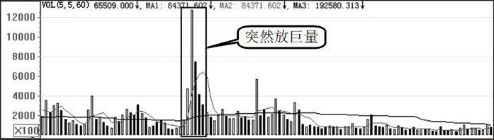 量不规则性放大缩小是指在没有突发利好消息或者大盘基本稳定的前提下,有某些实力不强的庄家为吸引市场关注,以便吸引散户买入或者高位出货所形成的成交情况,如图1-16所示。在成交量上表现为前期成交量的变动都非常正常,突然莫名其妙地放出历史巨量,随后又回归于平静。