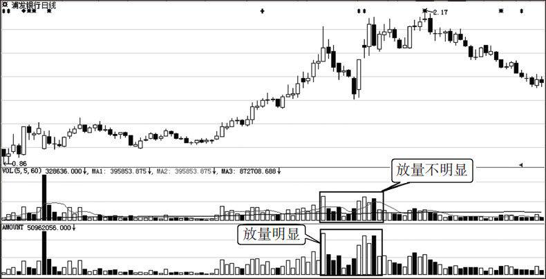 如图1-10所示的是浦发银行(600001)构筑头部时的K线图,用成交股数VOL指标来看,高位放量并不明显,主力似乎没有出货的现象。但是用成交金额AMOUNT指标来看,实际上已有一个高位放量、主力出货的过程。所以在股价高位判断头部时,要结合成交股数和成交金额一起研判,才能得出正确的结果。