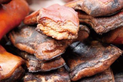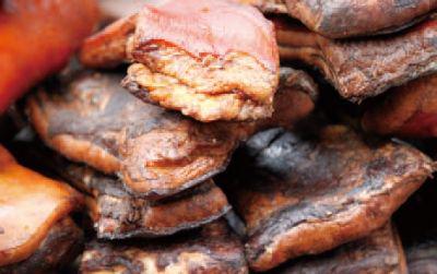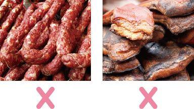 5 腊肉、熏肉: 加工成腊肉后,肉中的维生素几乎全部流失。腊肉的含盐量很高,不限制容易盐超标。特别是黑心商人用廉价猪肉和有毒染料胭脂红制作的劣质腊肉,胭脂红本身有较强烈的致癌作用。