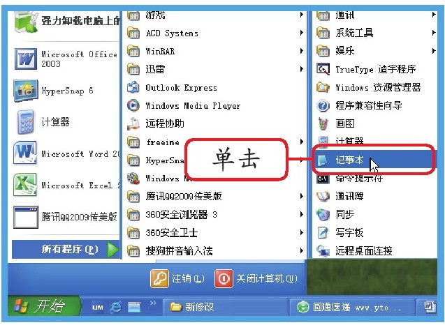 单击“开始”按钮,在弹出的“开始”菜单中执行“所有程序>附件>记事本”命令,打开“记事本”窗口。