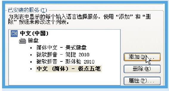 如果输入法列表中没有自己需要的输入法选项,则右击输入法图标,从弹出的快捷菜单中单击“设置”命令,弹出“文字服务和输入语言”对话框,在“已安装的服务”选项组中单击“添加”按钮,从弹出的对话框中选择需要的输入法即可。