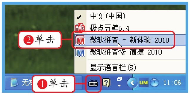 单击语言栏中的输入法图标,选择需要的输入法,如单击“微软拼音-新体验2010”选项。