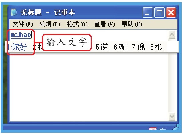 选择输入法后,就可以在编辑窗口中输入文字了。下面以在“记事本”中输入文字为例,介绍如何输入文字。