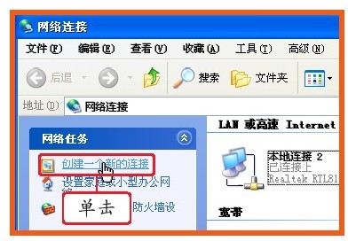 弹出“网络连接”窗口,在窗口左侧的“网络任务”选项组下单击“创建一个新的连接”链接。