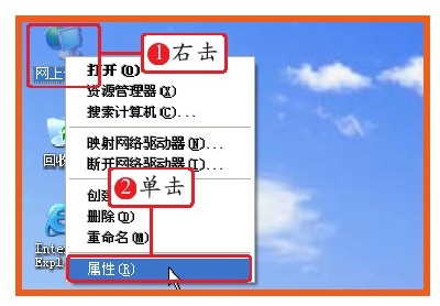 在桌面上右击“网上邻居”快捷图标,在弹出的快捷菜单中单击“属性”命令。