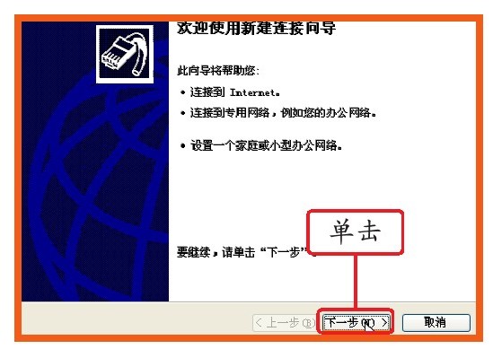 弹出“新建连接向导”对话框,在“欢迎使用新建连接向导”界面下单击“下一步”按钮。