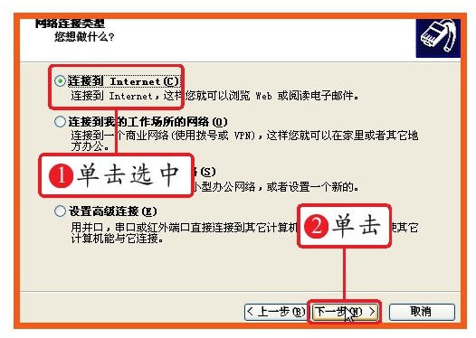进入“网络连接类型”界面,单击选中“连接到Internet”单选按钮,然后单击“下一步”按钮。