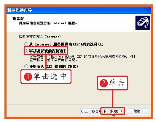 进入“准备好”界面,单击选中“手动设置我的连接”单选按钮,然后单击“下一步”按钮。