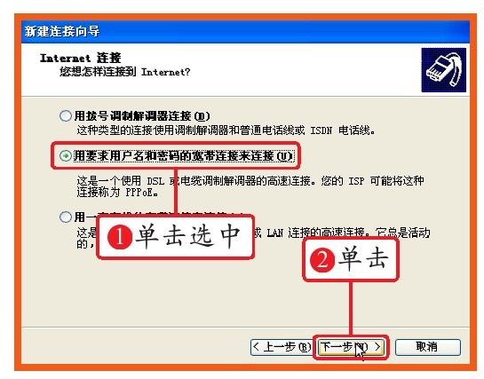 进入“Internet连接”界面,单击选中“用要求用户名和密码的宽带连接来连接”单选按钮,然后单击“下一步”按钮。