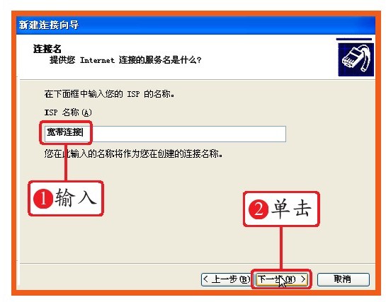 进入“连接名”界面,在“ISP名称”下的文本框中输入连接名,例如输入“宽带连接”,然后单击“下一步”按钮。
