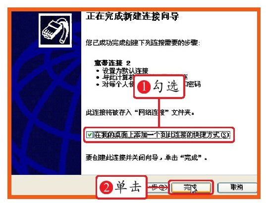 进入“正在完成新建连接向导”界面,勾选“在我的桌面上添加一个到此连接的快捷方式”复选框,然后单击“完成”按钮,完成操作。