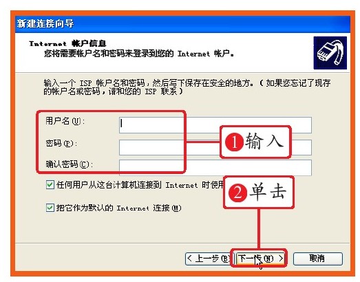进入“Internet账户信息”界面,在文本框内输入用户名和密码等信息,然后单击“下一步”按钮。