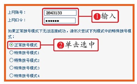 在“上网账号”和“上网口令”文本框中输入正确的账号和密码。然后在下方单击选中“正常拨号模式”单选按钮。