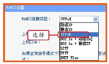 在“WAN口设置”界面的“WAN口连接类型”下拉列表中选择"PPPoE"选项。