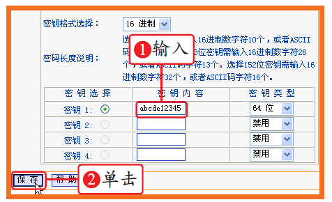 将“密钥1”选项右侧的“密钥类型”设置为64位,然后在“密钥内容”文本框中输入无线网络的密码,最后单击“保存”按钮。