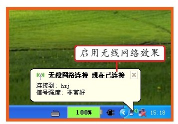 成功接入无线网络后,在桌面任务栏的通知区域内就会显示出相应的连接提示,并弹出输入密码的对话框。输入正确的密码后,就可以实现无线上网了。